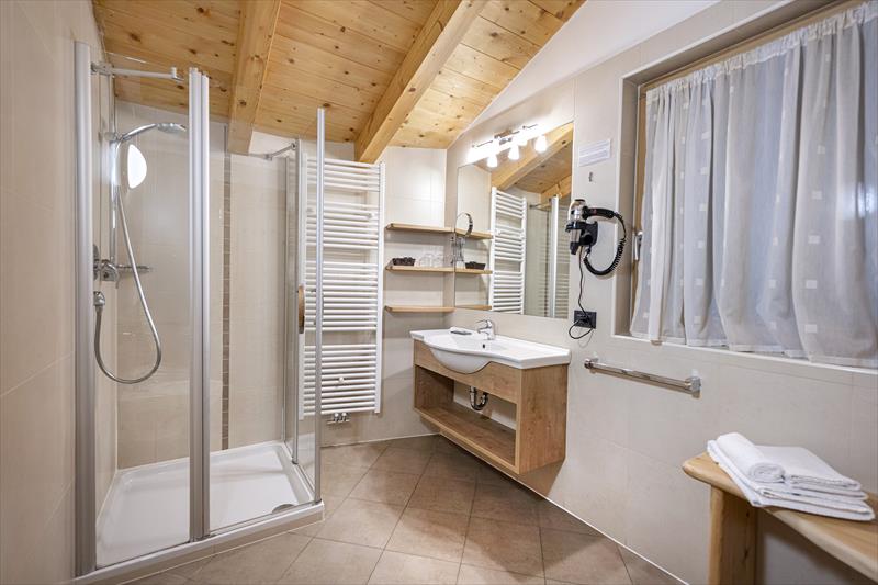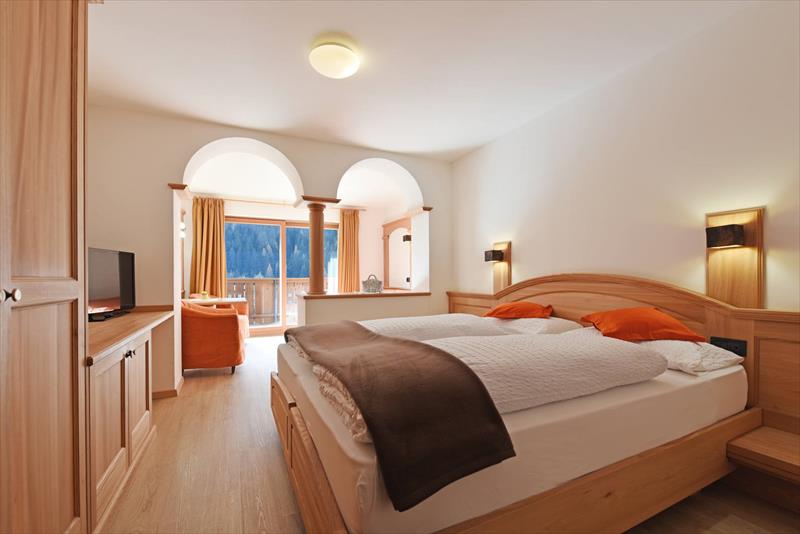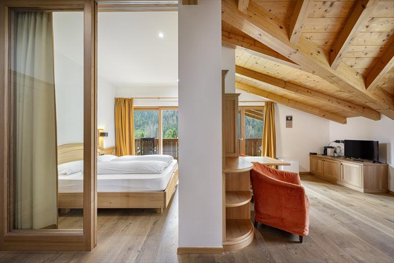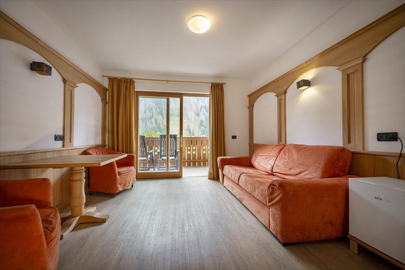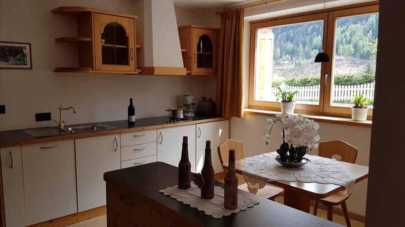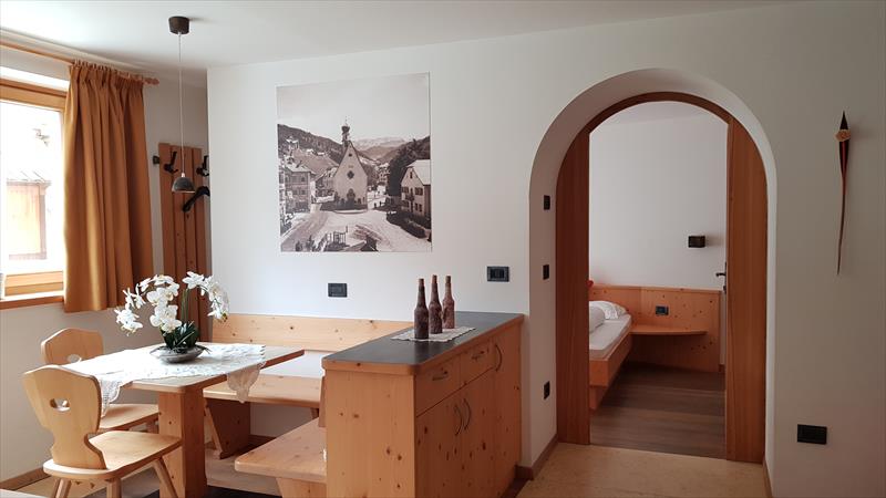 La zona-giorno è realizzata tutta in abete naturale con ampie vetrate e balcone con una vista mozzafiato sul Sassolungo.