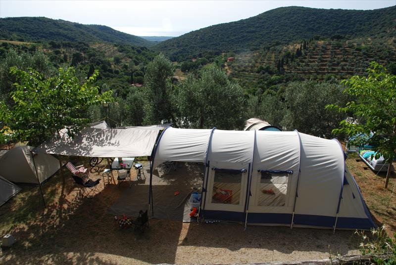 piccolo campeggio collinare panorama mare, 3 stelle, immerso nel verde, ristorante pizzeria, wifi gratis, 3 gruppi servizi igienici con docce calde gratis, alcune piazzole con servizi privati, bungalows