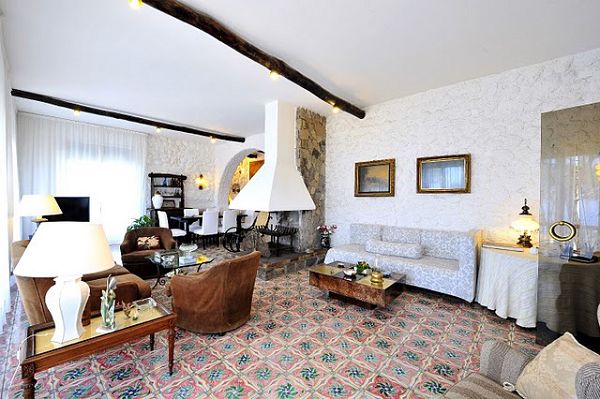 Interni: Villa Sole di Capri, 600 m2 su 3 livelli, per 13 persone, ideale per famiglie o gruppi. Al piano superiore: una camera matrimoniale, una camera con un letto, bagno con doccia. Al primo piano: ampio salotto con camino, libreria, schermo piatto 50 pollici, TV-sat, DVD e stereo, tre camere matrimoniali, una matrimoniale con bagno in camera – vasca Jacuzzi -, una camera doppia, 3 bagni, cucina (lavastoviglie, frigo grande, forno, micronde, toaster), ogni camera con Tv. Piano inferiore: lavanderia, sala “giochi” con tavolo da Ping-pong, sala biliardo.